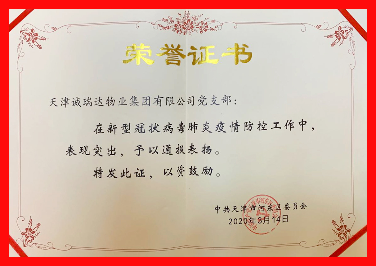 誠瑞達集團黨支部在新型冠狀病毒肺炎疫情防控工作中表現突出,榮獲河東區委通報表揚
