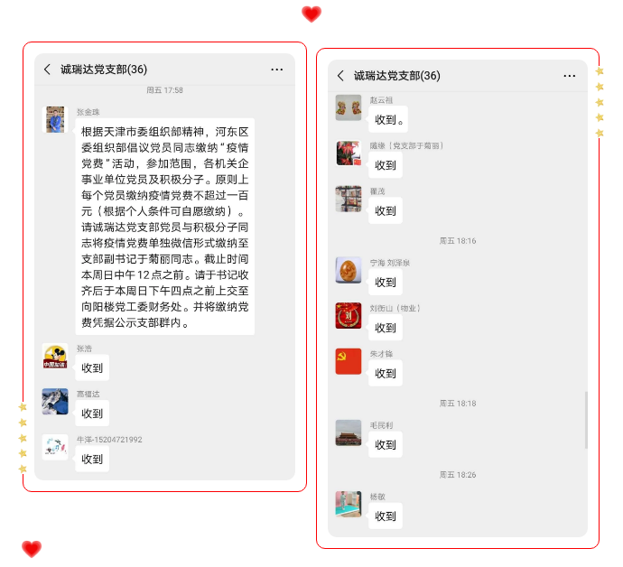 黨員們接到通知便積極行動起來,紛紛自愿捐出一份愛心,以表達對新冠肺炎疫情防控工作的支持。短短1天內,便有33名黨員向支部捐獻“疫情黨費“,共計人民幣壹萬元整。這筆帶著誠瑞達全體黨員濃濃心意的特殊黨費已于3月1日15時及時上交至中共河東區委向陽樓街道工作委員會。