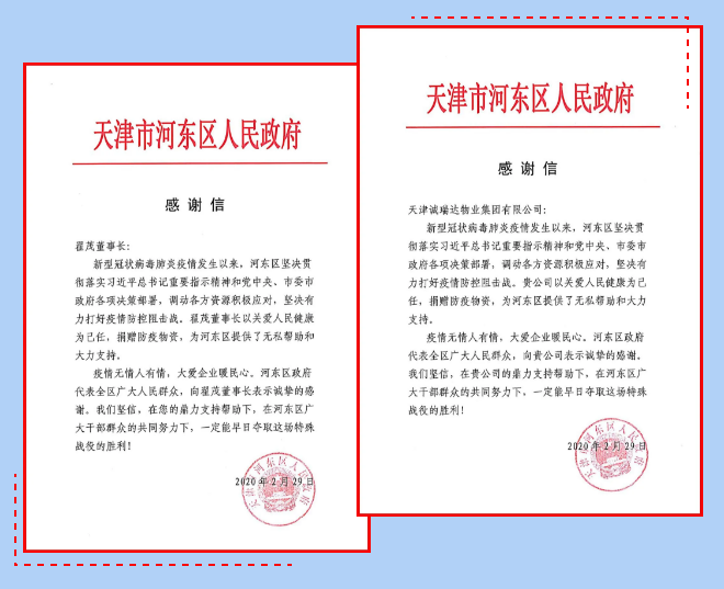 誠瑞達集團的捐贈行動,受到河東區人民政府的高度評價,并于2月29日,向集團公司發來感謝信兩封,對翟茂董事長和誠瑞達集團以關愛河東區人民健康為己任,捐贈防疫物資,為河東區提供無私幫助與支持表示敬意與感謝。
